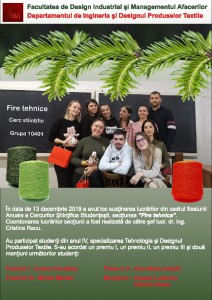 În cadrul sesiunii Cercurilor științifice studențești, ediția 2020, secțiunea Bazele designului industrial, studenții grupei 10102 au propus idei originale de design de produs, dezvoltate pentru suprafețe textile, articole de îmbrăcăminte și decorațiuni interioare.